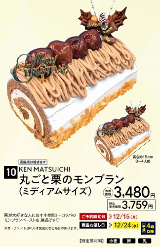 昨年大人気だった、イタリアのモンブランペーストを使って作った、渋皮栗がたくさん入ったモンブランが今年も登場しました。※オーナメント(飾り)は変更になる場合があります。