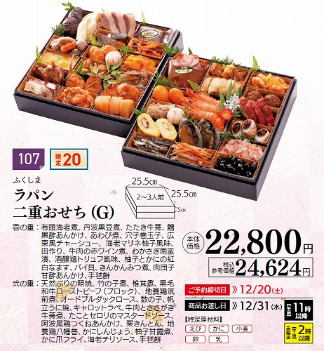 壱の重:有頭海老煮、丹波黒豆煮、たたき牛蒡、鱈黒酢あんかけ、あわび煮、穴子巻玉子、広東風チャーシュー、海老マリネ柚子風味、田作り、牛肉の赤ワイン煮、わかさぎ南蛮漬、酒醸鶏トリュフ風味、柚子とかにの紅白なます、バイ貝、きんかんみつ煮、肉団子甘酢あんかけ、手毬餅 弐の重:天然ぶりの照焼、竹の子煮、椎茸煮、黒毛和牛ローストビーフ(ブロック)、地養鶏筑前煮、オードブルダックロース、数の子、帆立うに焼、キャロットラぺ、牛肉とささがき牛蒡煮、たことセロリのマスタードソース、阿波尾鶏つくねあんかけ、栗きんとん、地養鶏八幡巻、かにしんじょう、柚子甘露煮、かに爪フライ、海老チリソース、手毬餅