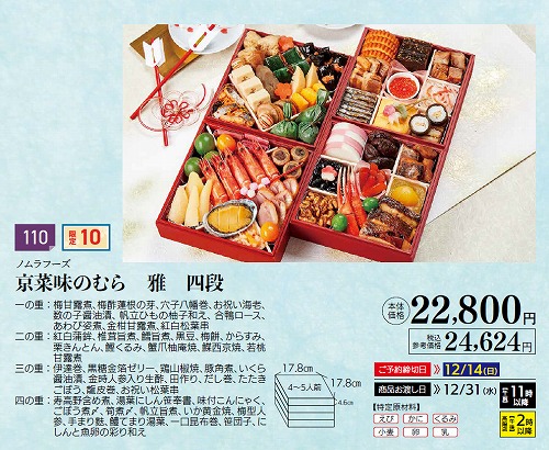 一の重:梅甘露煮、梅酢蓮根の芽、穴子八幡巻、お祝い海老、数の子醤油漬、帆立ひもの柚子和え、合鴨ロース、あわび姿煮、金柑甘露煮、紅白松葉串 二の重:紅白蒲鉾、椎茸旨煮、鱈旨煮、黒豆、梅餅、からすみ、栗きんとん、鰹くるみ、蟹爪柚庵焼、鰈西京焼、若桃甘露煮 三の重:伊達巻、黒糖金箔ゼリー、鶏山椒焼、豚角煮、いくら醤油漬、金時人参入り生酢、田作り、だし巻、たたきごぼう、龍皮巻、お祝い松葉串四の重:寿高野含め煮、湯葉にしん笹奉書、味付こんにゃく、ごぼう煮〆、筍煮〆、帆立旨煮、いか黄金焼、梅型人参、手まり麩、鱧てまり湯葉、一口昆布巻、笹団子、にしんと魚卵の彩り和え