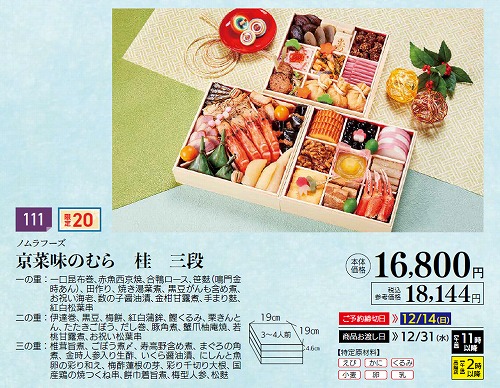 一の重:一口昆布巻、赤魚西京焼、合鴨ロース、笹麩(鳴門金時あん)、田作り、焼き湯葉煮、黒豆がんも含め煮、お祝い海老、数の子醤油漬、金柑甘露煮、手まり麩、紅白松葉串 二の重:伊達巻、黒豆、梅餅、紅白蒲鉾、鰹くるみ、栗きんとん、たたきごぼう、だし巻、豚角煮、蟹爪柚庵焼、若桃甘露煮、お祝い松葉串 三の重:椎茸旨煮、ごぼう煮〆、寿高野含め煮、まぐろの角煮、金時人参入り生酢、いくら醤油漬、にしんと魚卵の彩り和え、梅酢蓮根の芽、彩り千切り大根、国産鶏の焼つくね串、餅巾着旨煮、梅型人参、松麩