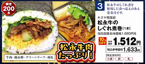 【商品内容】 松永牛肉たっぷり!松永牛のしぐれ煮を使用した食べ応えのある巻寿司です。